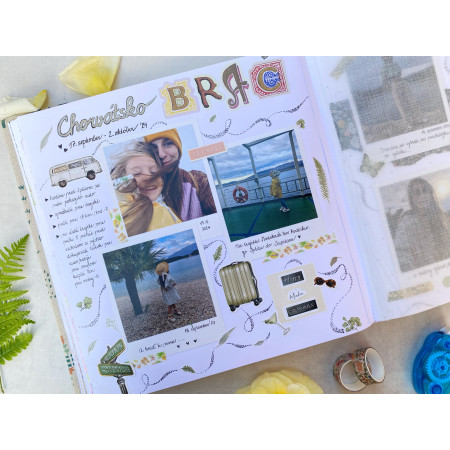 Fóliu jednoducho odlepíte. Pod ňou je prázdna strana so štruktúrou a lepkavým povrchom. Skvelou správou je, že lepidlo nebudete potrebovať. Vôbec. Bude vám úplne zbytočné. Aj washi pásky budú plniť len ozdobnú funkciu. Samolepiace fotoalbumy urobia všetku prácu samé. Nemusíte sa zdržovať žiadnymi lepidlami ani páskami. Stačí len priložiť fotku a je to. Keď bola stránka hotová, stačí jemne, kúsok po kúsku prilepiť späť priesvitnú fóliu tak, aby nezostali bublinky. Presne tým spôsobom, ako keď lepíte tapetu na stenu. A hotovo. Na stranu sa zmestia 2-4, podľa toho, aký formát fotky ste si vytlačili.