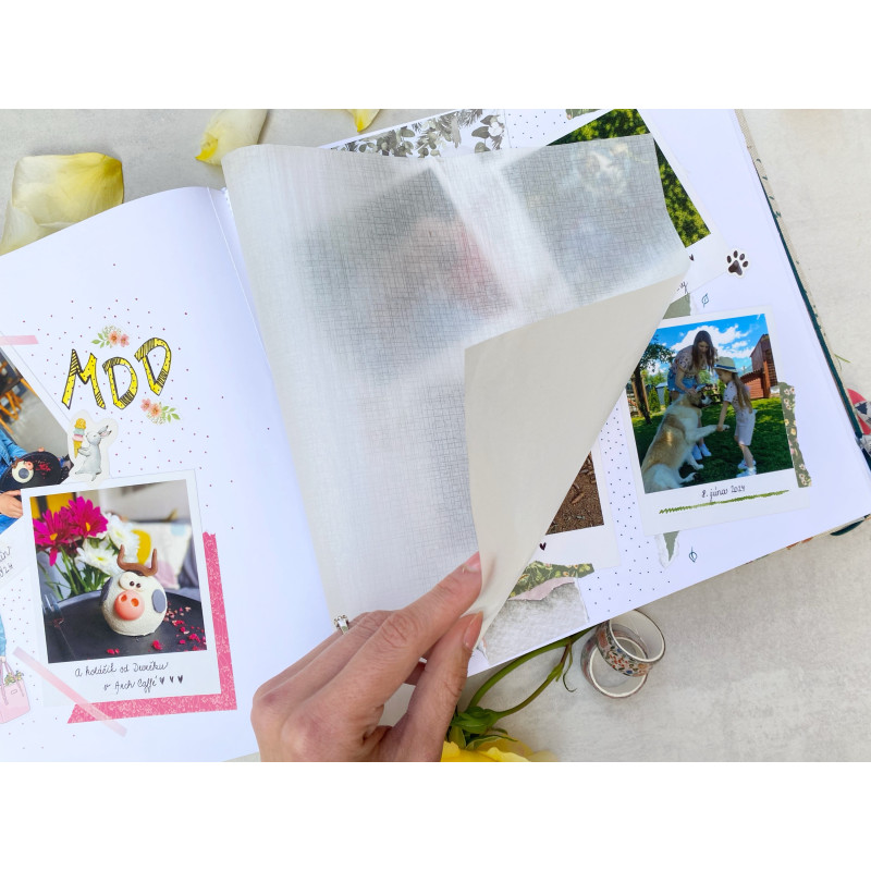Ak sa vám nejaká strana nepozdáva, jednoducho stačí odlepiť fóliu, premiestniť fotky, niečo doplniť bez toho, aby bolo vidieť nejaký zásah. So stranami viete neustále pracovať. Fotku vybrať, vložiť tam inú. Nelepíte ich tam, len jemne