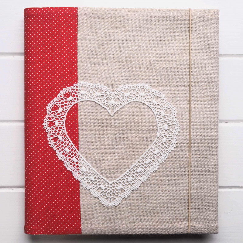 Prírodný ľan dopĺňa červený bodkovaný pás a veľké čipkové srdce, takže album pôsobí ľudovo, romanticky a zároveň vkusne. V obývačke urobí radosť ako pekná dekorácia – niečo, čo chcete mať na očiach, nie schované v skrini.