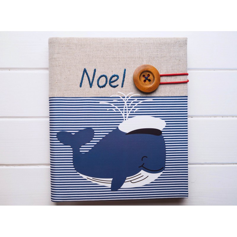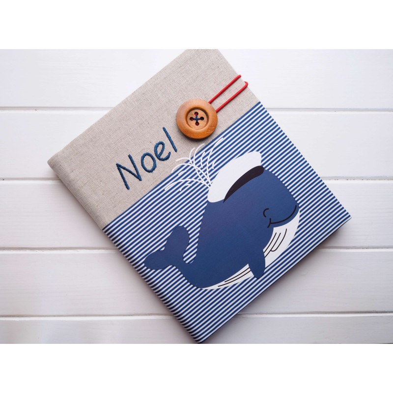 Pre malého námorníka (alebo ako darček pre bábätko – najmä pre chlapčeka) je tento album rozkošný a svieži – kombinácia prírodného ľanu, námorníckych pásikov a veľrybky v modrých tónoch pôsobí hravo, ale stále čiso Detail dreveného gombíka a farebnej gumičky mu dodáva originálny šmrnc a meno na obálke krásne ukáže, komu spomienky patria.