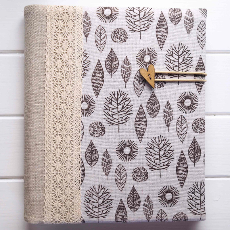 Jemný prírodný album v neutrálnych tónoch, ktorý zapadne do každého interiéru. Kombinácia režného chrbta, čipkového pásu a bielej látky s botanickým vzorom pôsobí čisto a nadčasovo. Detail dreveného srdiečka a praktická gumička dotvárajú jednoduchý, „severský“ štýl – krásny rodinný album aj univerzálny darček.
