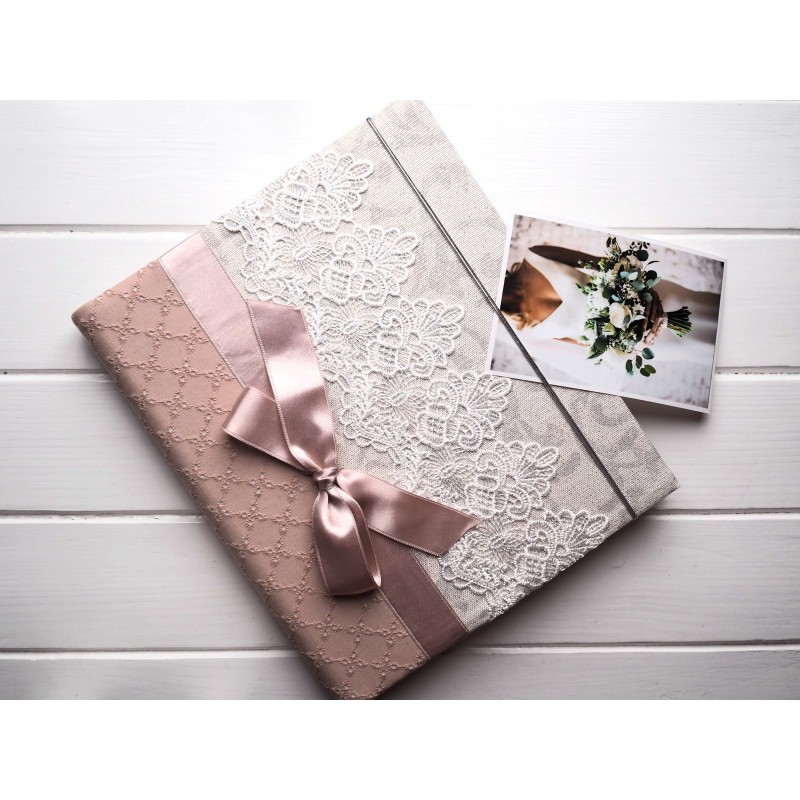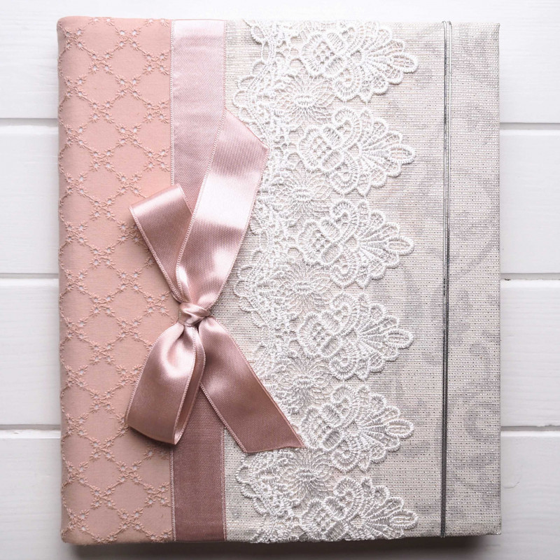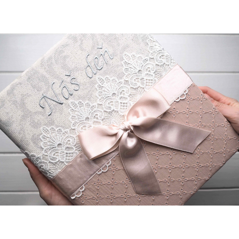 Tento svadobný album je nežný a elegantný – staroružová látka, výrazná biela čipka a saténová mašľa pôsobia romanticky a krásne vyniknú aj vystavené na poličke v obývačke či spálni. Je to typ albumu, ktorý poteší už pri darovaní… a pri listovaní po rokoch dojíma znova.