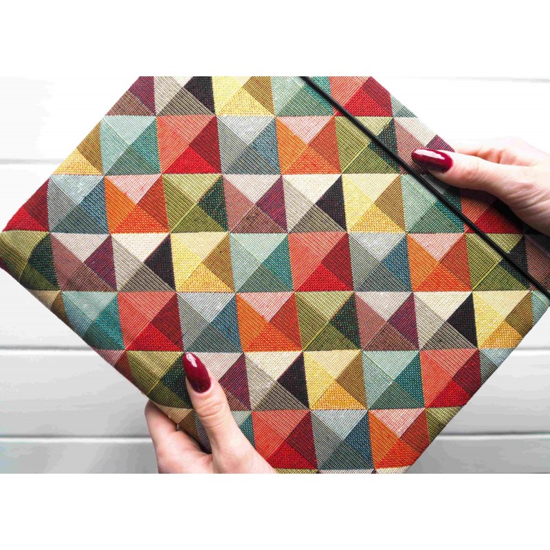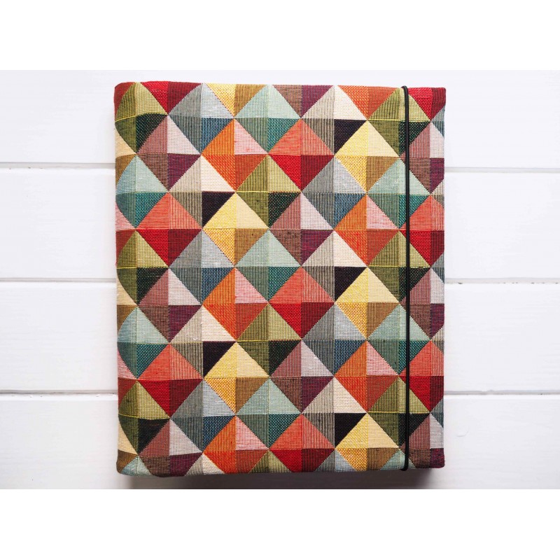 Obal je z gobelínovej látky s mozaikou trojuholníkov v teplých aj studených tónoch – pôsobí moderne, hravo a zároveň vkusne. Rozžiari poličku v obývačke, pracovňu aj študentskú izbu a krásne zapadne do moderného interiéru.