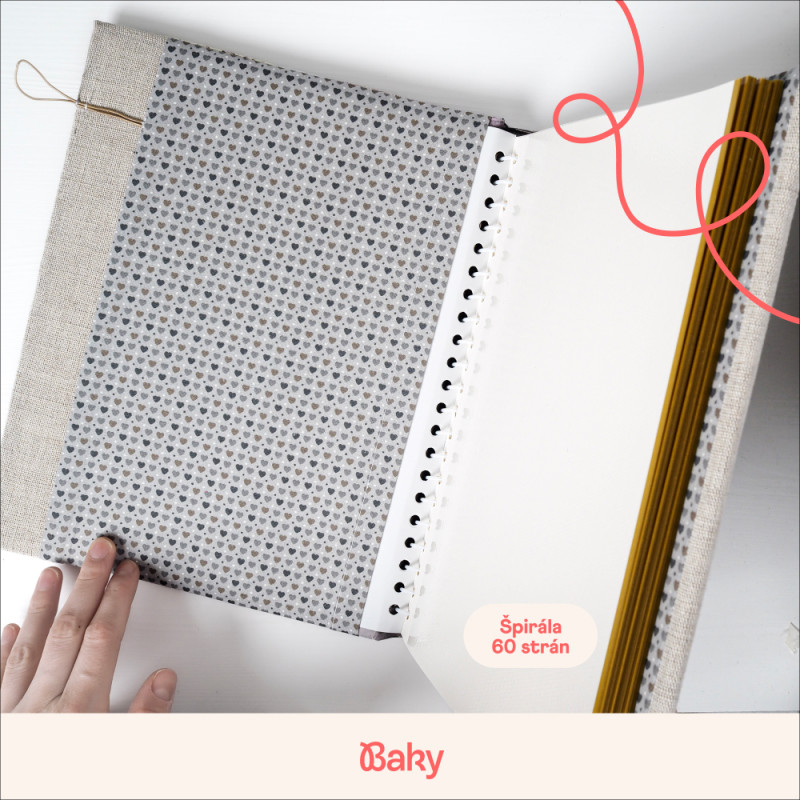 Každý kus je ručne vyrábaný v malej rodinnej dielni na Slovensku a môže sa v detailoch jemne líšiť. Praktické zapínanie na gumičku drží väzbu pevne pokope, takže sa album neotvára ani keď je plný a často sa v ňom listuje.