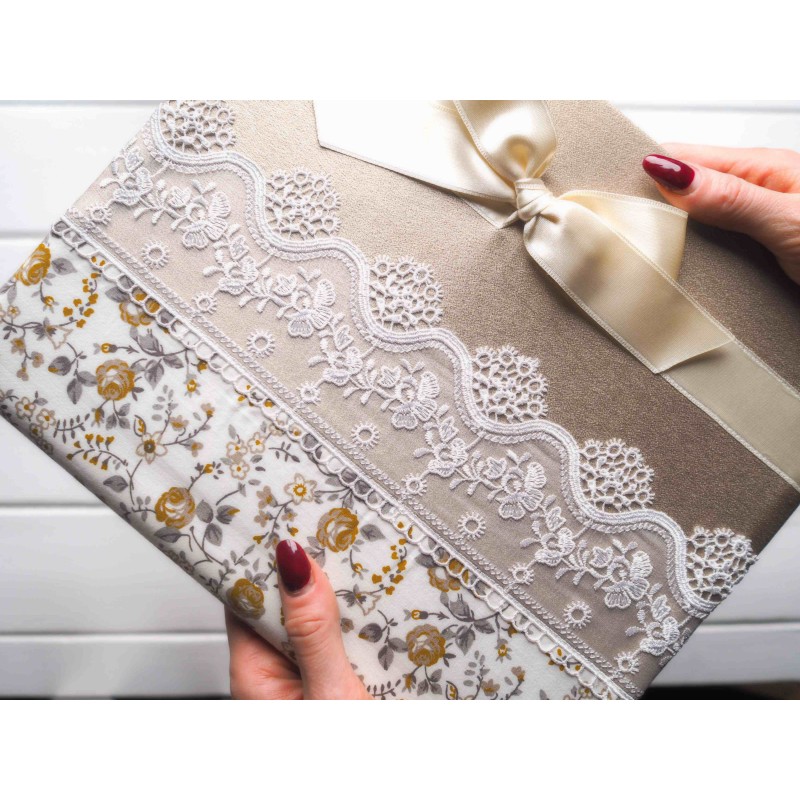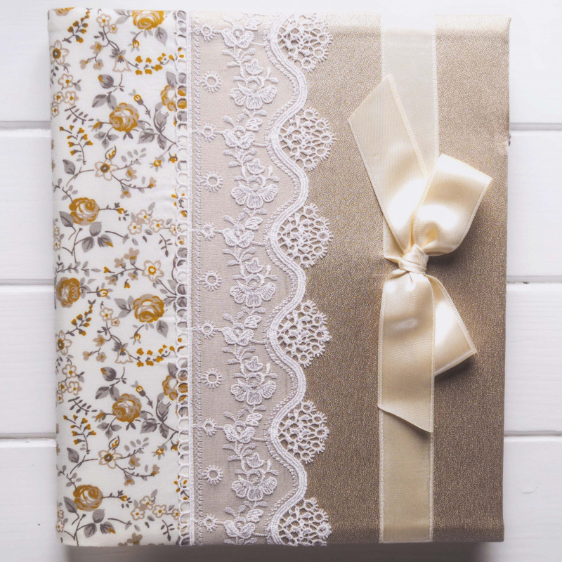 Tento album je presne ten typ „slávnostného, ale stále jemného“ kúsku. Kombinácia bielej látky so zlatými kvetmi, výraznej čipky a šampanského zlatého poťahu pôsobí elegantne a romanticky – krásny na svadobné fotky, výročie, ale aj ako rodinný album, ktorý necháte vystavený v obývačke či spálni. Mašľa v smotanovej farbe mu dáva pekný darčekový detail.