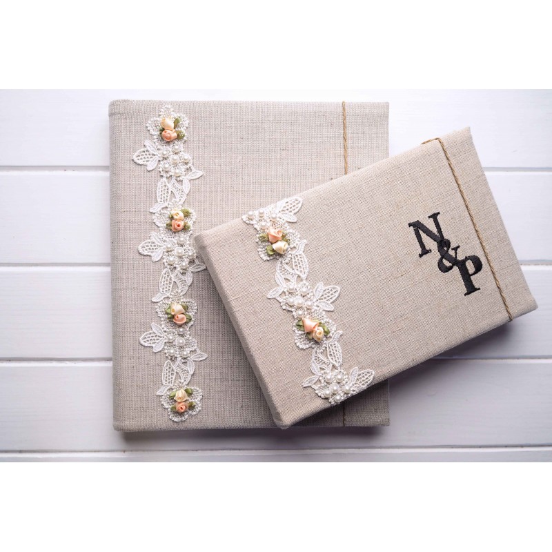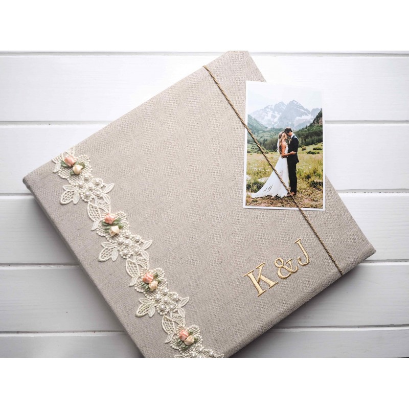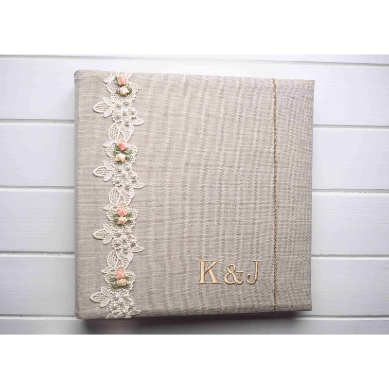 Svadobný handmade fotoalbum s iniciálkami a dátumom – Vintage PREMIUM (krajka + perličky) | samolepiaci / na fotorožky