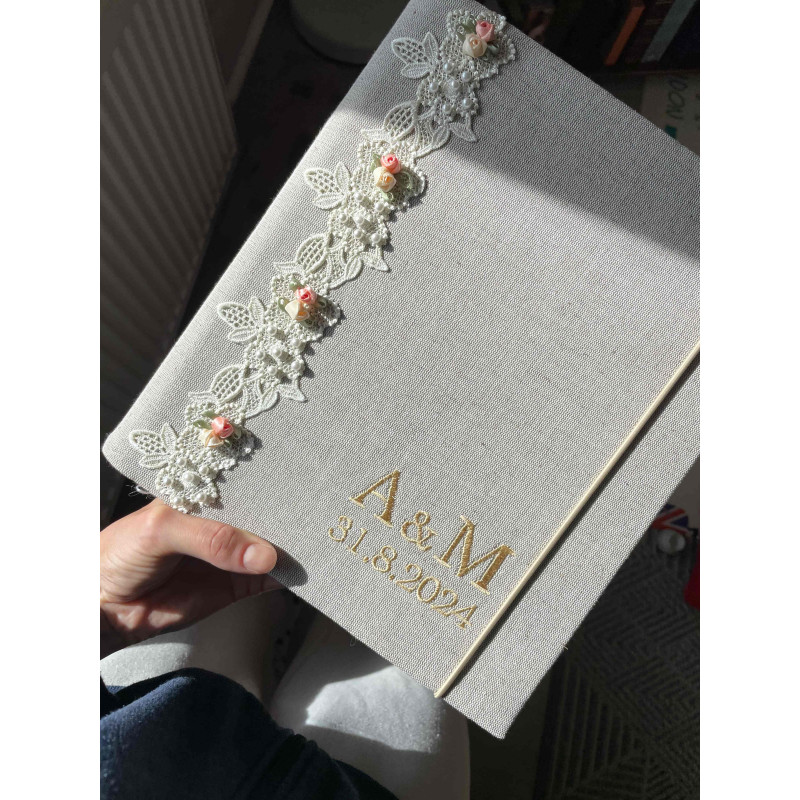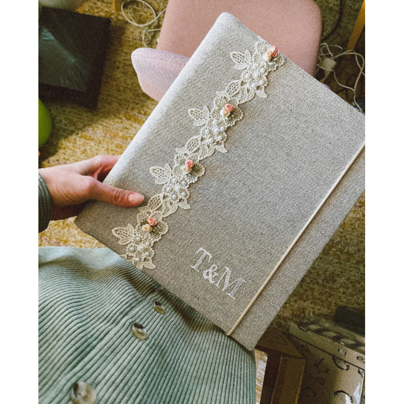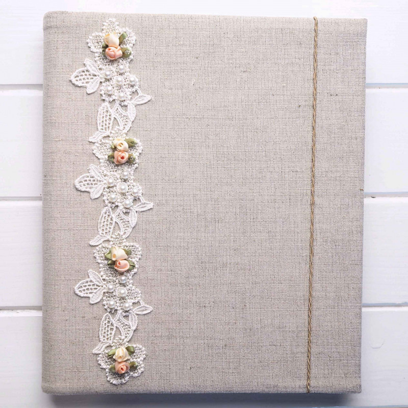 Album šijeme ručne v malej rodinnej dielni na Slovensku z pevného plátna a zdobíme ručne spracovanou korálkovou krajkou s detailmi. Zapínanie na gumičku je praktické – aj keď je album plný fotiek, neotvára sa a drží pekný tvar.