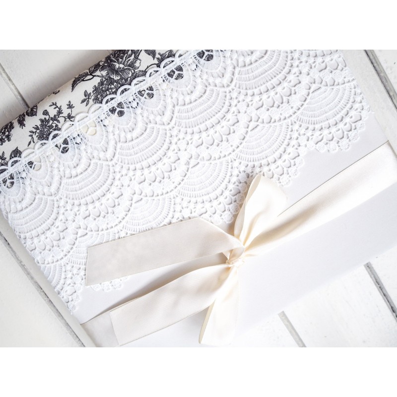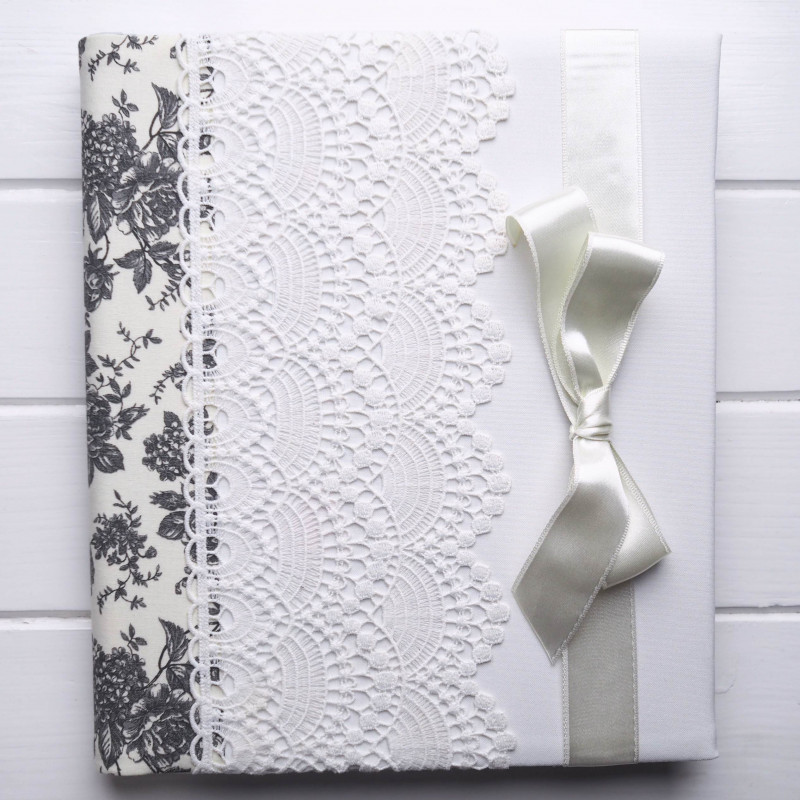 Pre nevestu, ktorá miluje čistú eleganciu a „všetko do biela“, je tento album nádherne slávnostný – hladký biely obal dopĺňa výrazná čipka, saténová mašľa a jemný kontrast sivobieleho kvetinového vzoru na chrbte. Pôsobí luxusne a nadčasovo, ideálny na svadobné fotky, zásnuby aj tie najdôležitejšie momenty, ktoré si chcete uchovať na celý život.
