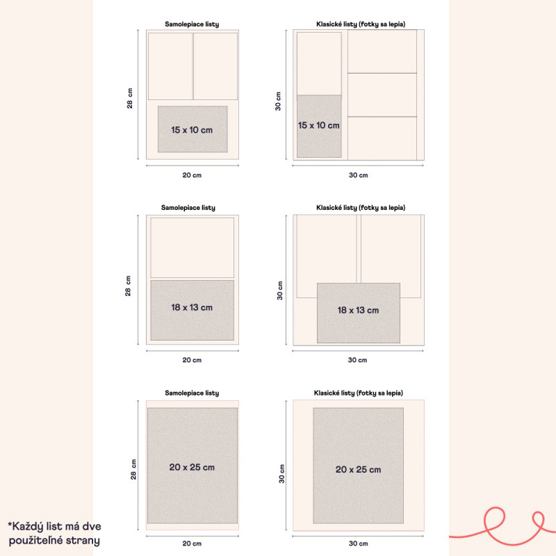 Fóliu jednoducho odlepíte. Pod ňou je prázdna strana so štruktúrou a lepkavým povrchom. Skvelou správou je, že lepidlo nebudete potrebovať. Vôbec. Bude vám úplne zbytočné. Aj washi pásky budú plniť len ozdobnú funkciu. Samolepiace fotoalbumy urobia všetku prácu samé. Nemusíte sa zdržovať žiadnymi lepidlami ani páskami. Stačí len priložiť fotku a je to. Keď bola stránka hotová, stačí jemne, kúsok po kúsku prilepiť späť priesvitnú fóliu tak, aby nezostali bublinky. Presne tým spôsobom, ako keď lepíte tapetu na stenu. A hotovo. Na stranu sa zmestia 2-4, podľa toho, aký formát fotky ste si vytlačili.