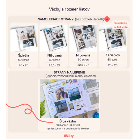Vnútro si vyberiete podľa seba: samolepiace listy alebo verzia na fotorožky. Do albumu môžete ukladať aj kombinovať fotky 9×13, 10×15, 13×18 aj Polaroid/Instax. Počet listov si zvolíte podľa potreby (30–70 listov = 60–140 strán).