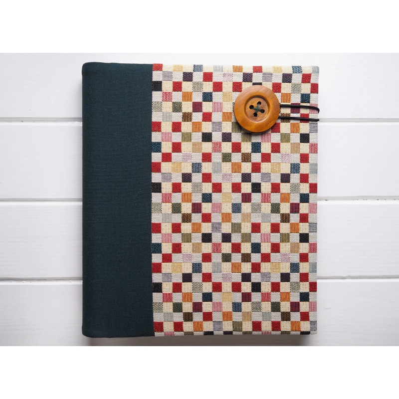 Tento album je pre ľudí, ktorí majú radi čistý dizajn a detail. Tmavozelený chrbát dopĺňa výrazná „mozaika“ z drobných farebných štvorčekov a celé to krásne uzatvára drevený gombík. Pôsobí moderne, ale stále útulne – bude peknou dekoráciou v obývačke, pracovni aj na poličke medzi knihami. (A áno, je to aj limitovaný kúsok – každý vyzerá trošku inak.)