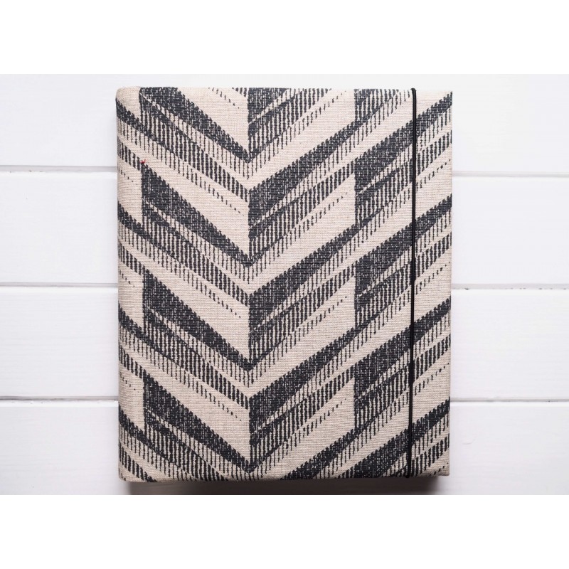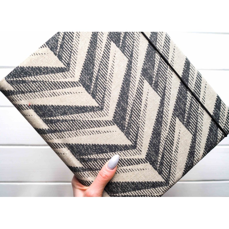 Obal má výrazný chevron (zig-zag) vzor v čiernej na prírodnom podklade. Je neutrálnejší, takže zapadne do moderného, industriálneho aj škandinávskeho interiéru – v obývačke či pracovni pôsobí ako pekný doplnok, nie „krabica na fotky“.