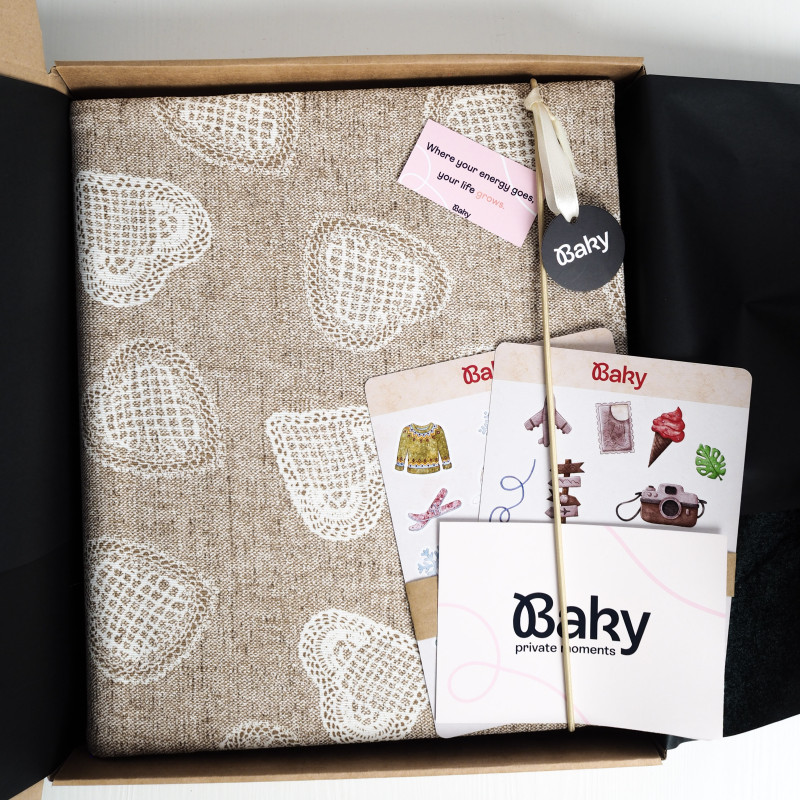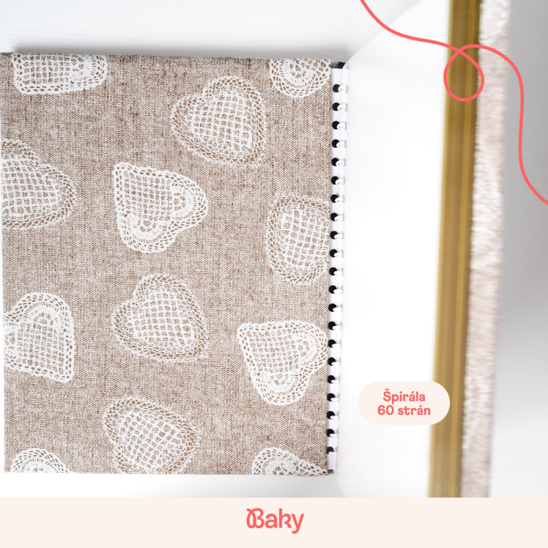 Každý kus šijeme ručne v malej rodinnej dielni na Slovensku, preto sa môže v detailoch jemne líšiť. Väzbu drží praktická gumička – udrží album pekne pokope a drží tvar aj vtedy, keď je plný spomienok a často ho beriete do rúk.